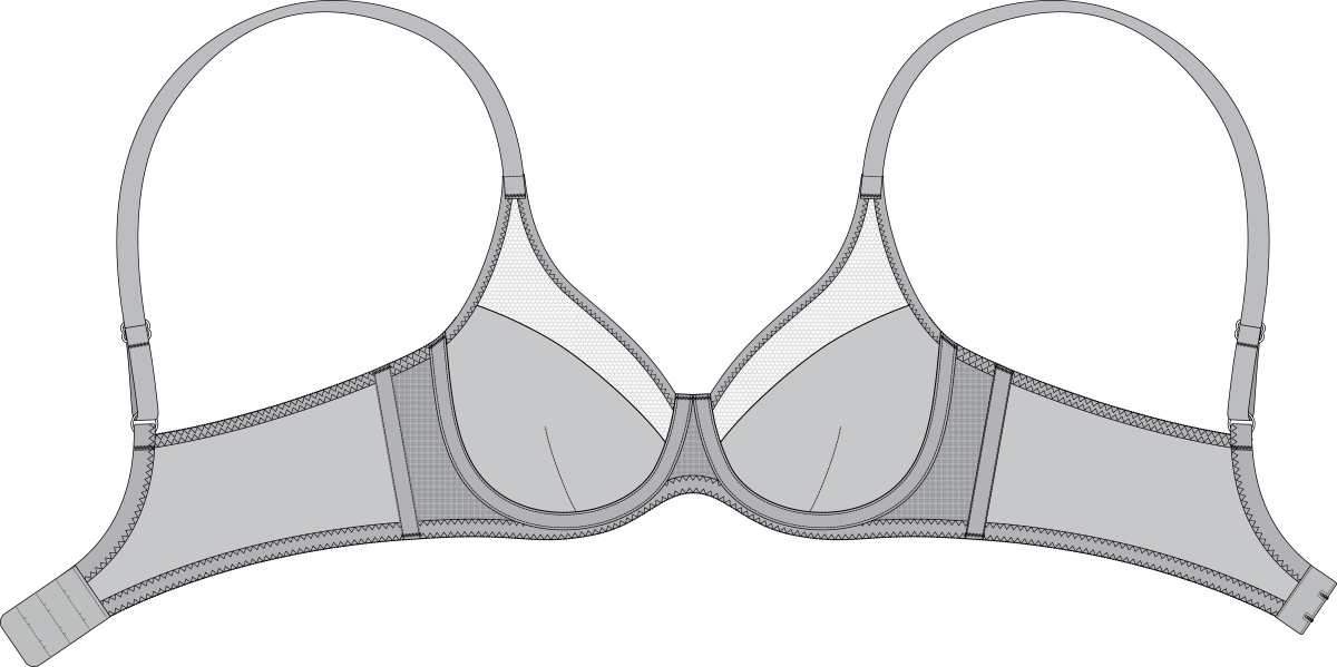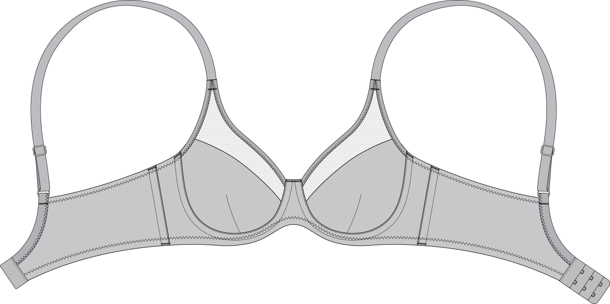 Бюстгальтер на каркасах. Каркасы 1 ТИПа. Чашка из эластичного трикотажного полотна с Кр=0,85 и эластичной сетки с Кр=0,85 состоит из двух частей: